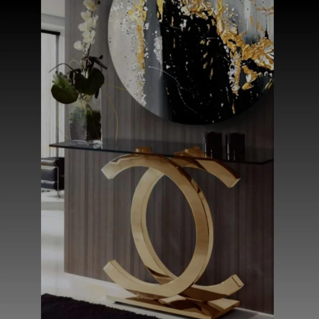 Introducing D’LUJO’s The Intertwined Console Table, a stunning centerpiece that redefines contemporary luxury. The table is a testament to innovative design, featuring a magnificent base of two interlocking, fluid shapes forged from durable, polished brass or gold-finished stainless steel. This bold, sculptural form provides not only a captivating visual but also exceptional stability. The base beautifully supports a clear tempered glass top, which adds a sense of lightness and allows a full view of the artistic craftsmanship below. The seamless fusion of a minimalist glass top and a bold, artistic base makes this table a truly unique and luxurious piece. The Intertwined is an ideal addition to a modern entryway, a high-end lounge, or a formal living room, where it will serve as a functional work of art, embodying the very essence of the D’LUJO brand.