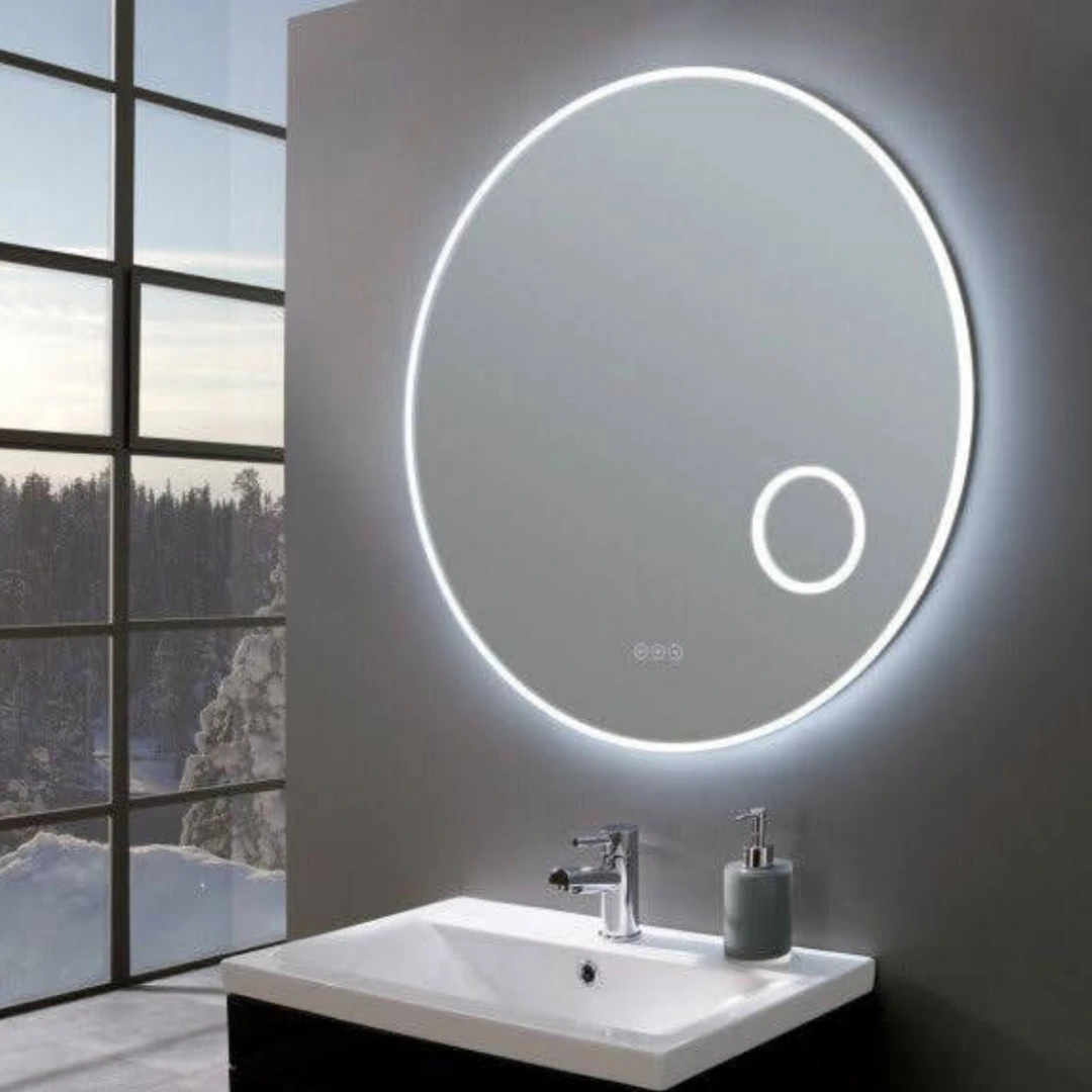 This modern round mirror combines minimalist design with smart technology. Featuring a touch-sensitive button for adjusting light, it offers perfect illumination for any task. Its sleek, frameless profile is a statement of modern luxury, ideal for a contemporary bathroom setting.